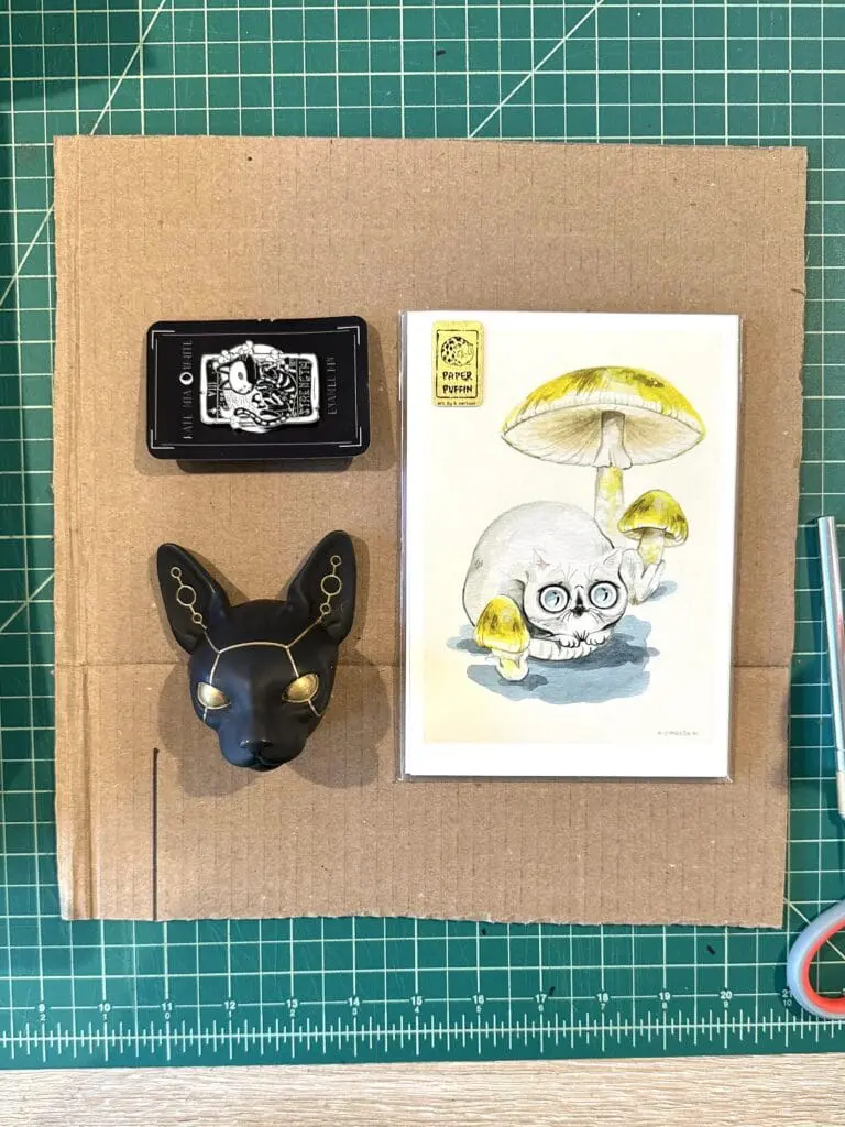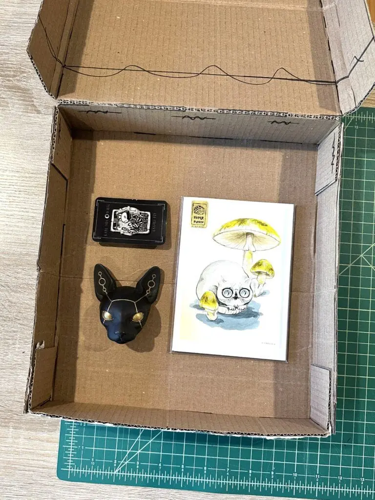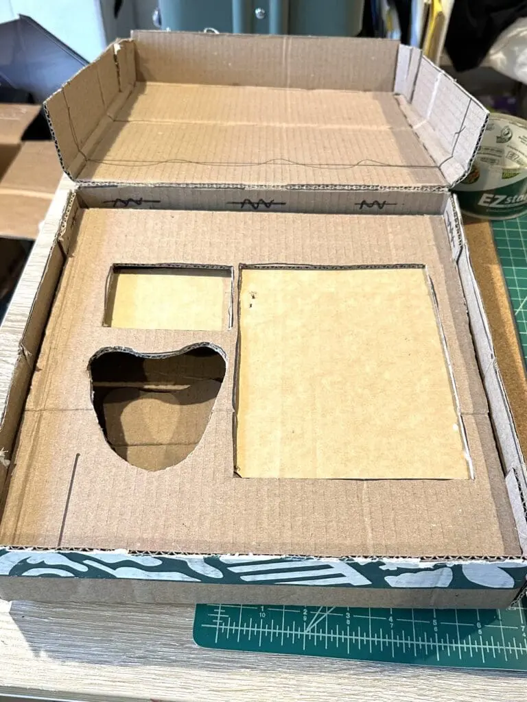 Next, arrange the items on the insert, and trace loosely around them. Leave some extra space so the items won’t be squeezed in. Then, cut out holes in the cardboard for each item you plan to include. Keep the piece of cardboard you cut out, and use it to elevate any the items that seem too short for the full depth of the box. You can hold these up off the bottom of the box with small cardboard supports.