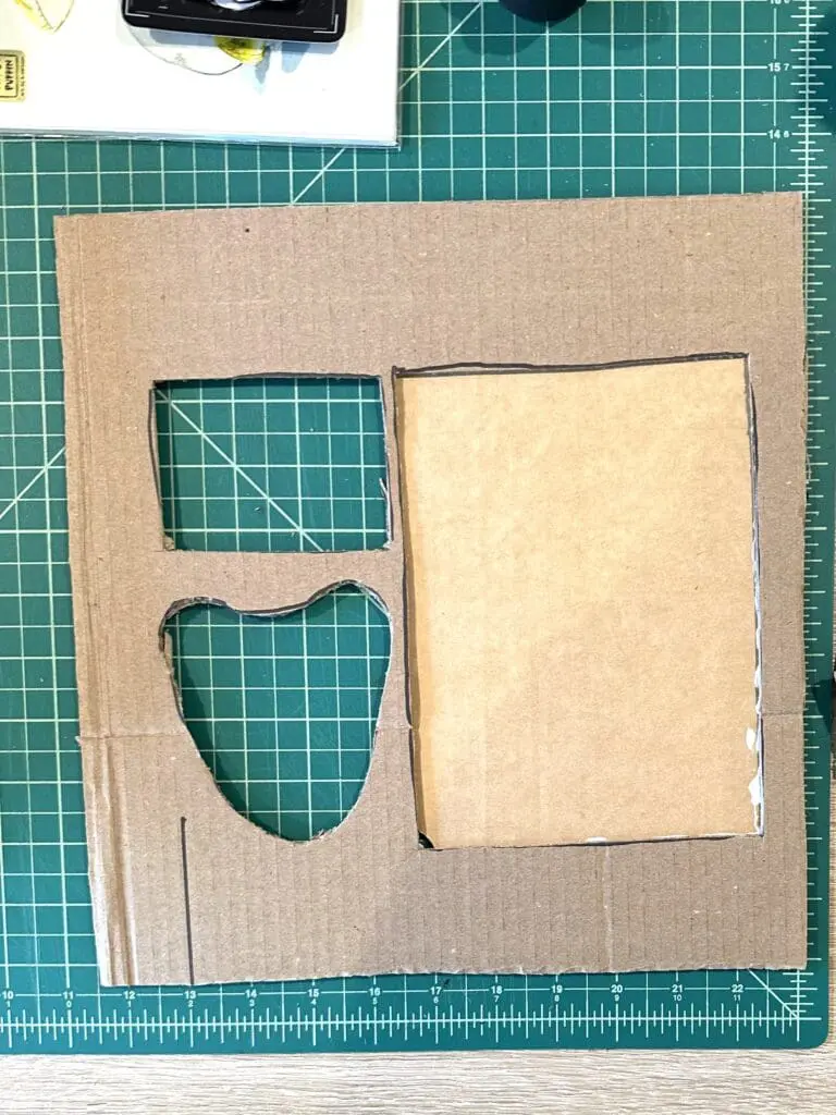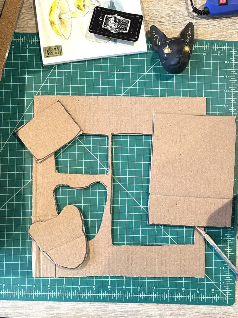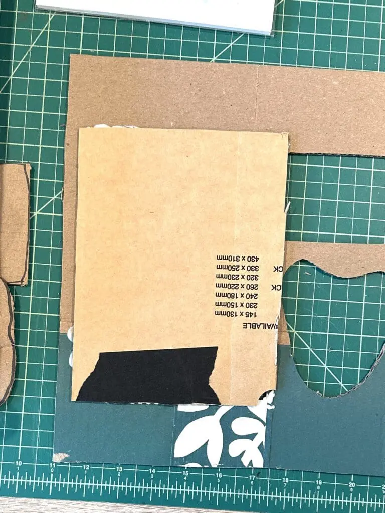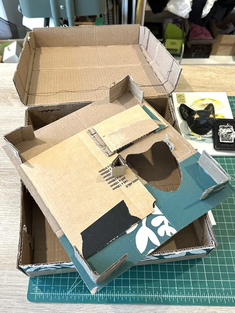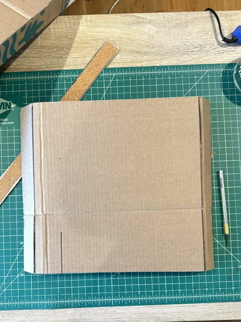Cut another piece of cardboard to be the insert for the interior of the box. You may want to make the insert shorter than the items so the gifts are easy to pick up. You can cut the cardboard so that it can be bent to create ‘legs’ that will hold up the surface, or use pieces of cardboard glued to the bottom to hold it up. In this tutorial, I’ve used the second method.