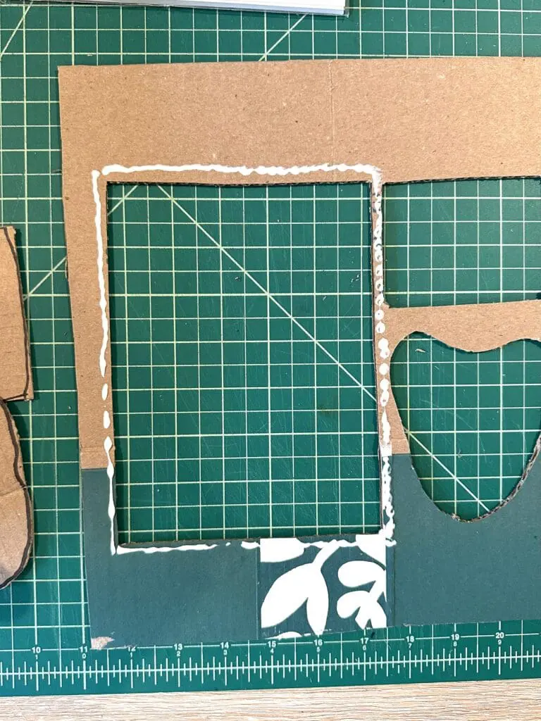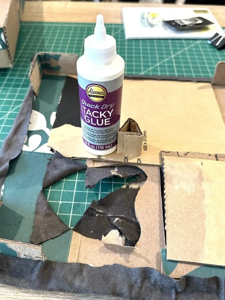 Make sure to use fabric or paper that is larger than the box insert so there is enough material to fold into the holes you cut. Put a few beads of glue along one side of the hole in the cardboard, and smooth out the fabric or paper over the glue (I used the bottom end of a sharpie). I used tacky glue since it dries faster, but craft glue will work as well. Work around the edge of the hole until you have the fabric fully secured.