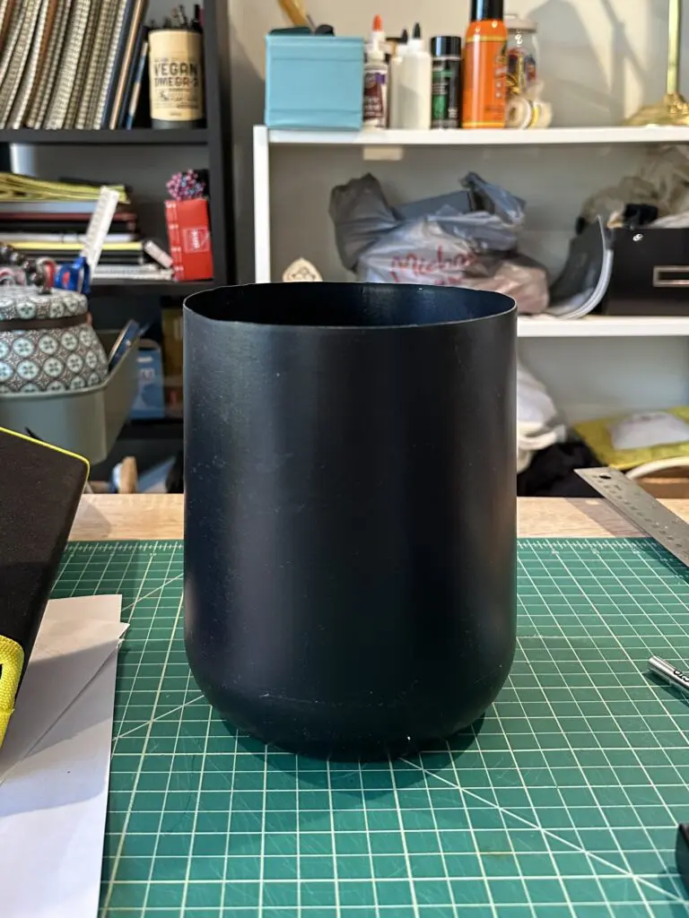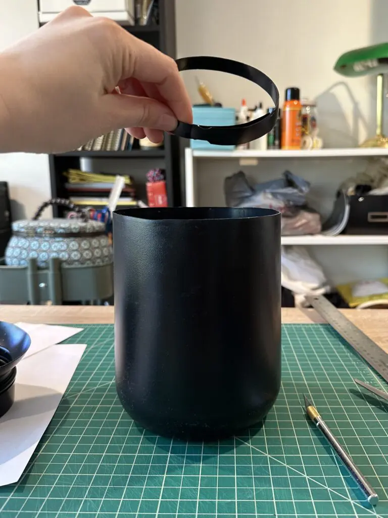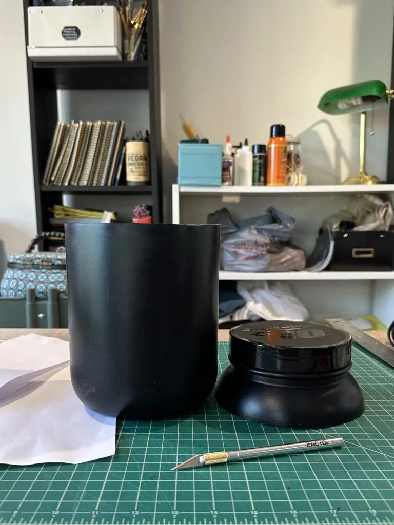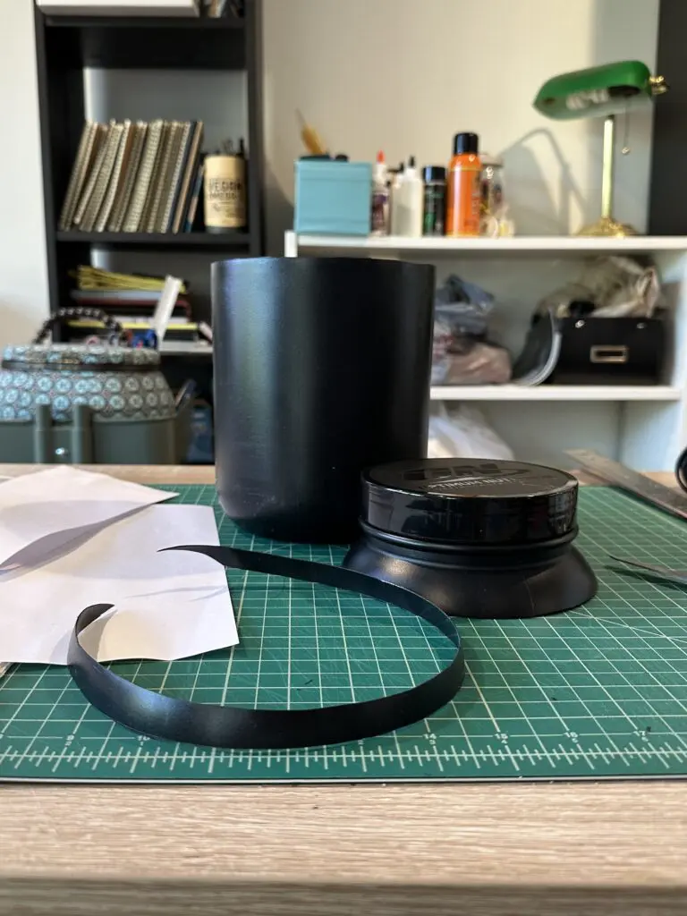 Wrap a sheet of paper around the container to get a straight edge for cutting off the top. Tape the paper in place so it doesn’t slide away.