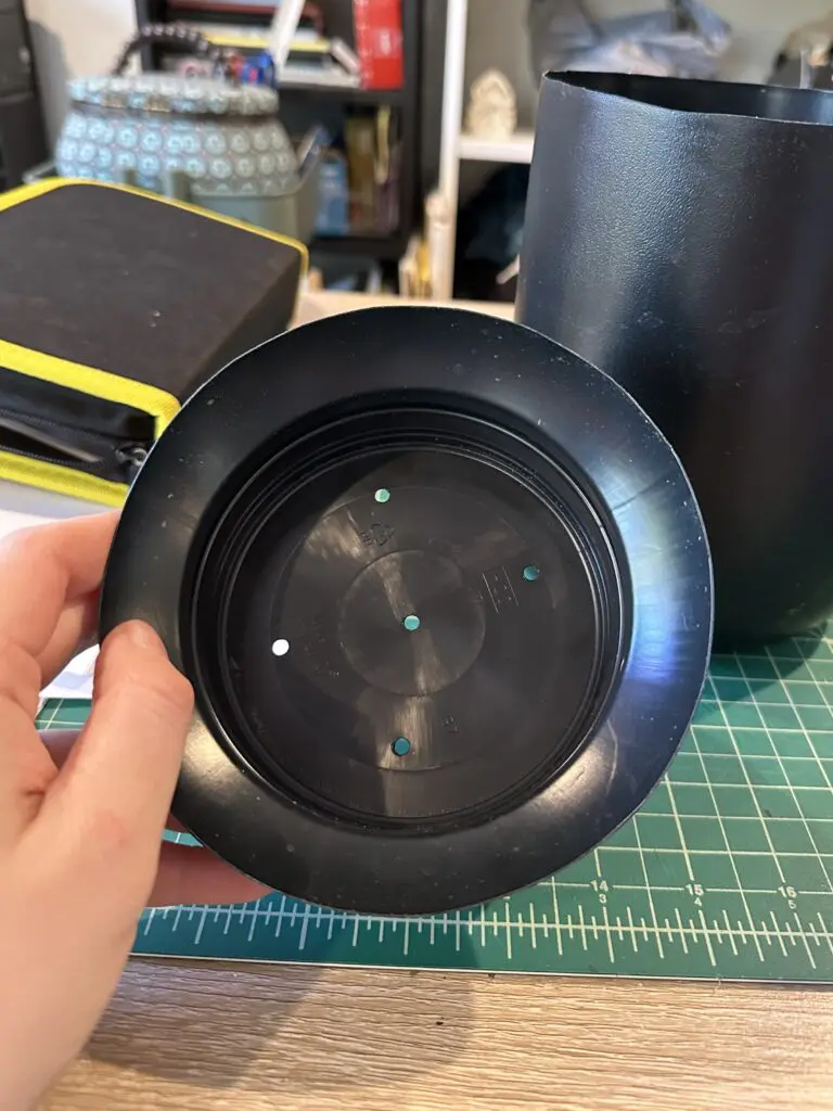 Place the small circle of plastic in the bottom of the pot. Push the top of the container down into the bottom of the pot, with the lid on the bottom.