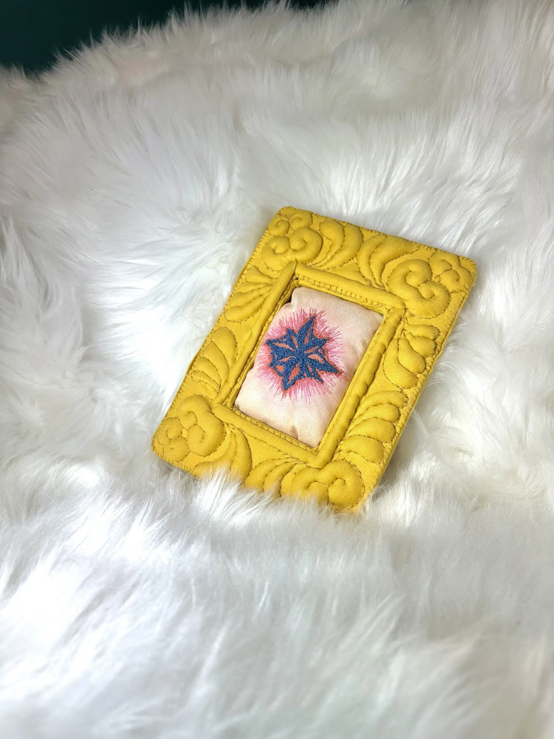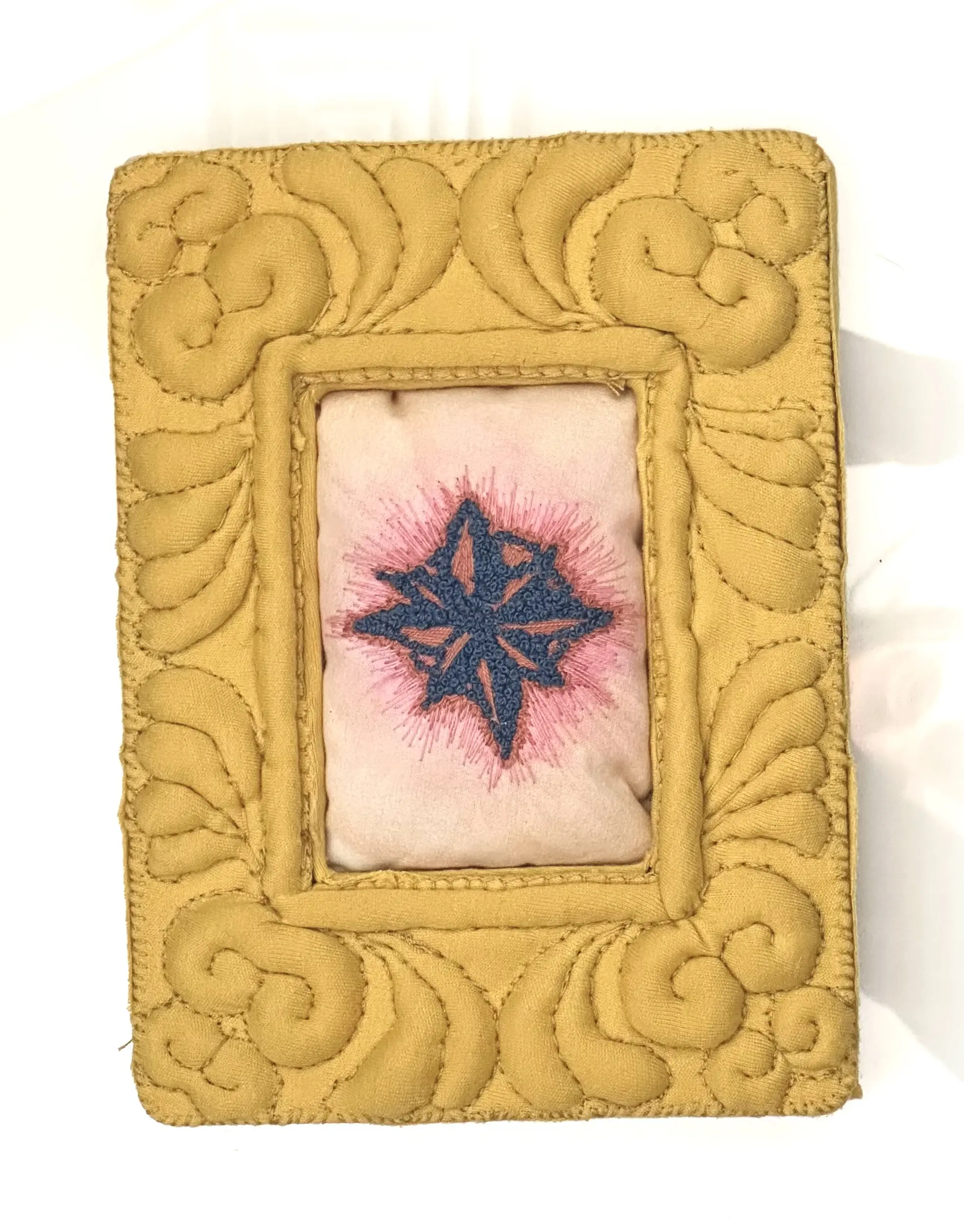Embroidery depicting an infected compass tattoo, displayed in a quilted fabric frame. The back of the frame includes a hanger.